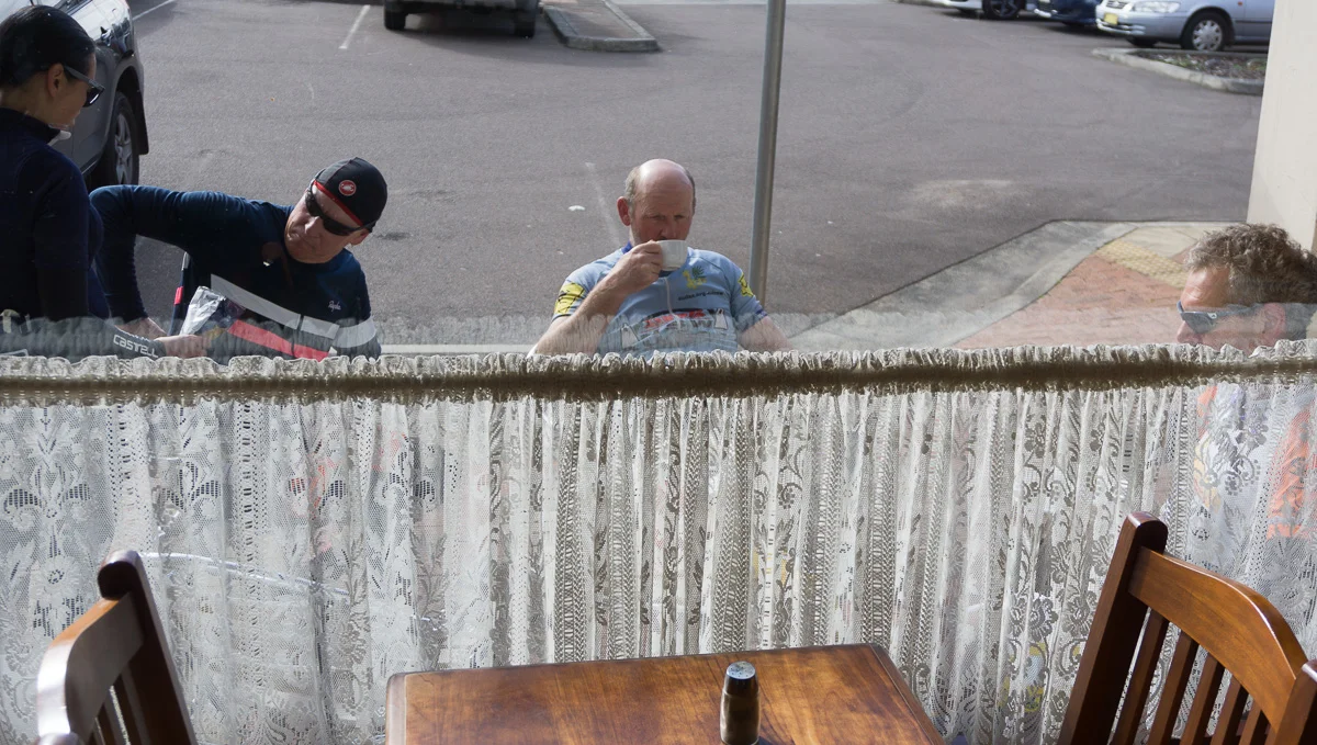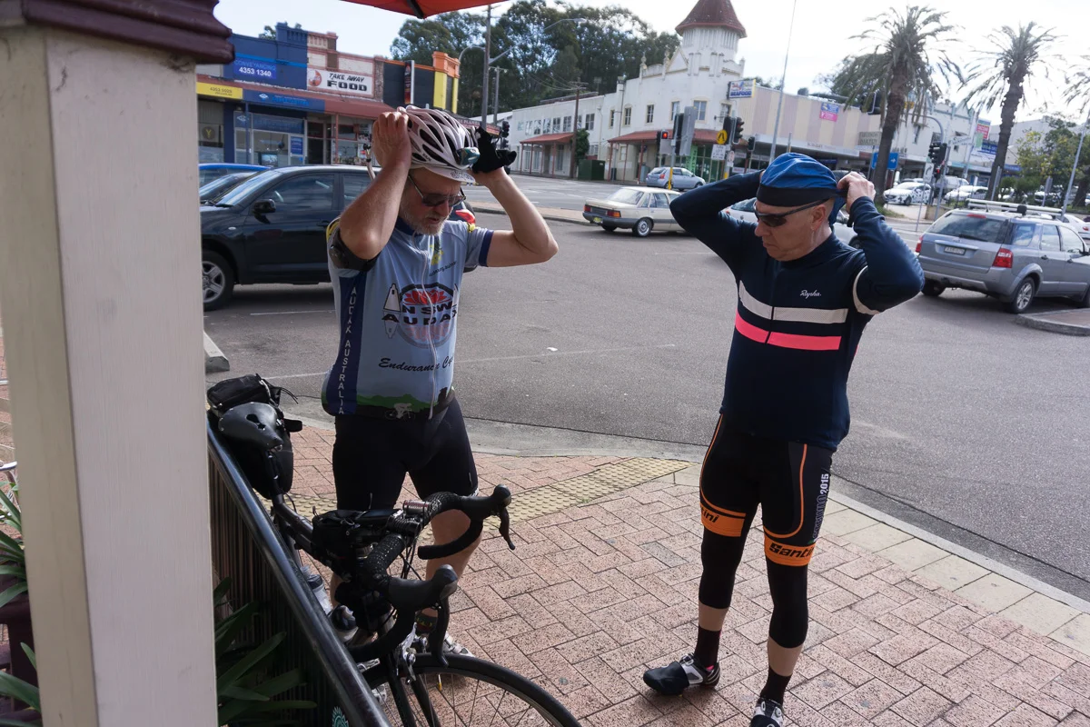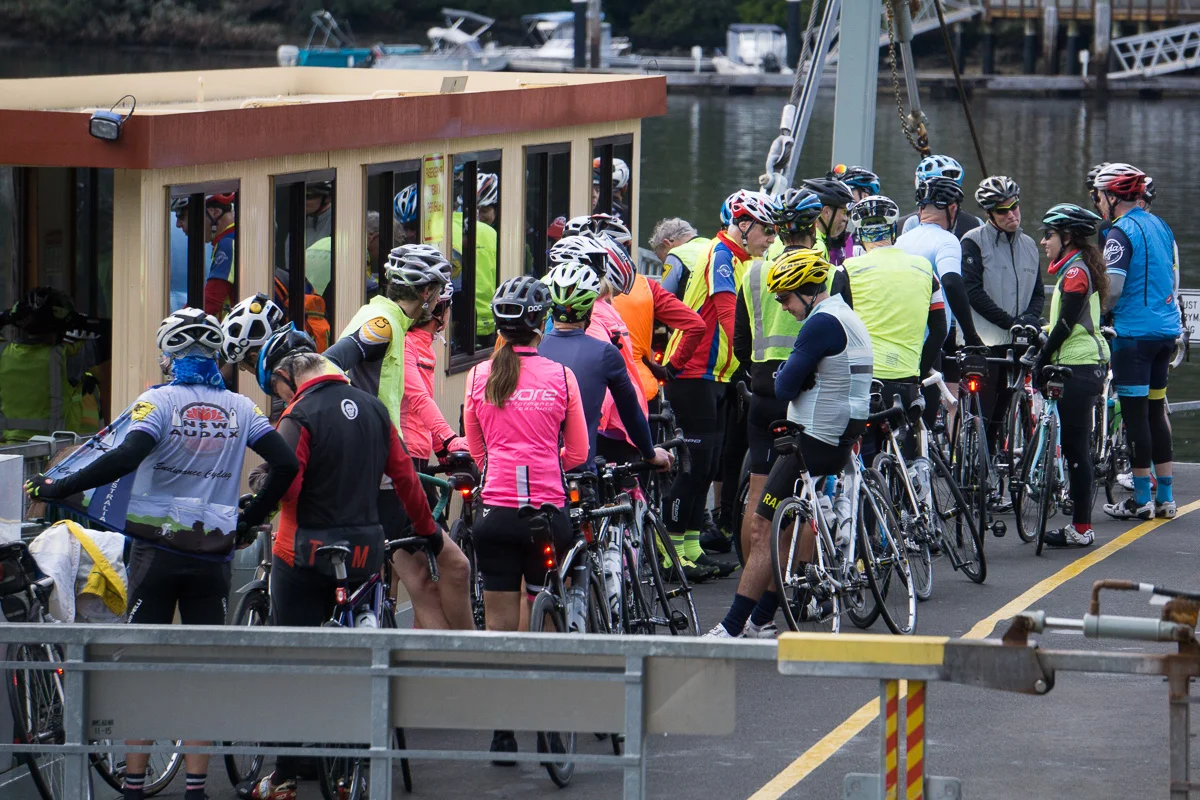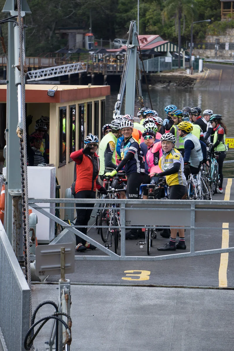To my surprise we catch a large group of the riders at Berowra Ferry, I have to tell the ferry man that I won't be crossing to the other side. It's nice to stop here, swap my short lens for the telephoto. A good randonneur with an eye on the clock would be downing food also, making use of the forced downtime.