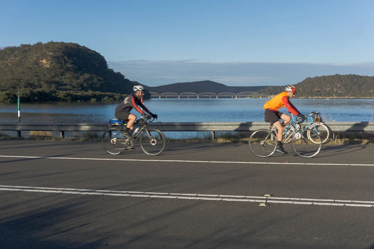 I'm tiring of all this chasing. I pull over to get a shot of my bike on the Mooney Mooney side of the Hawkesbury River and it is a very short wait before the riders are passing.